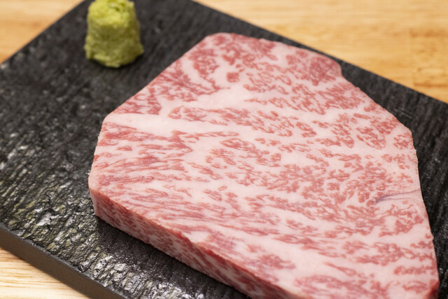 特筆すべきは、提供された瞬間に目を奪われるお肉の美しさです。